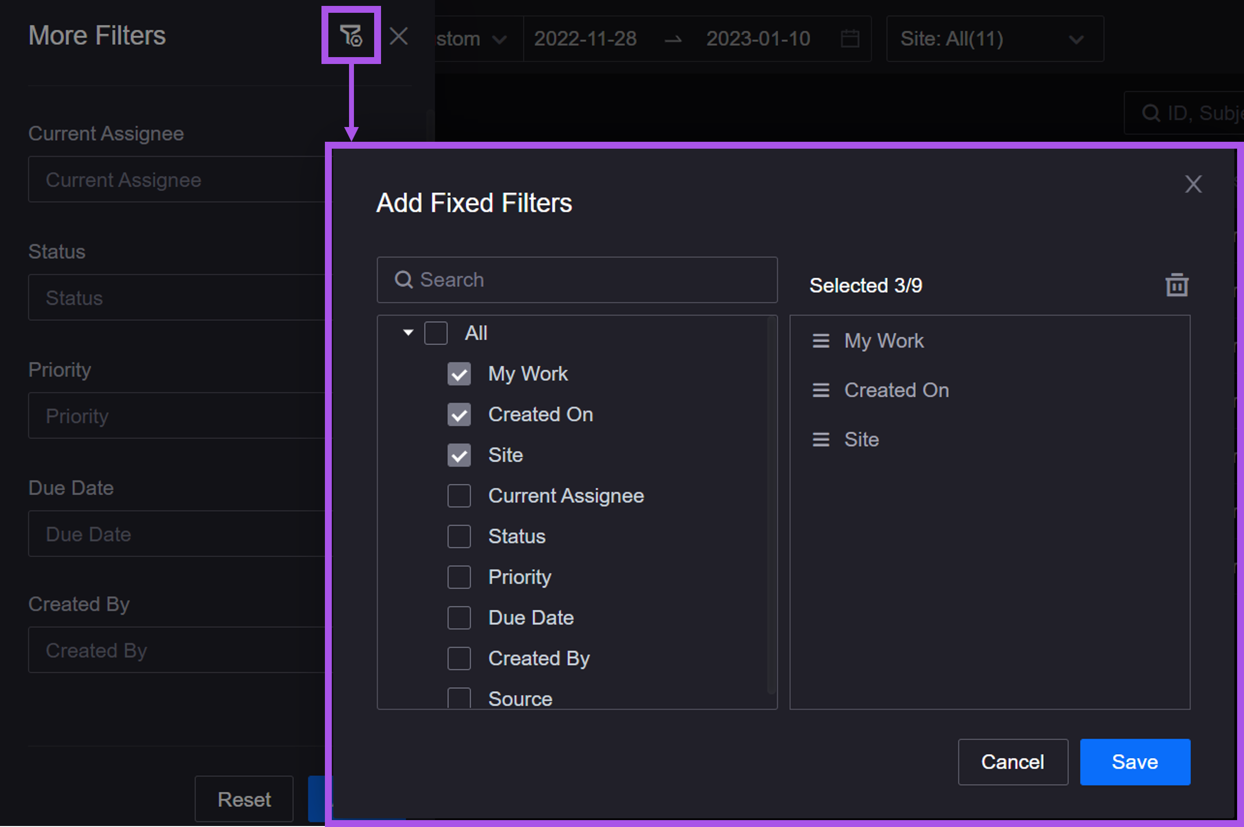 On the Service Requests list page, you can place commonly used filters in the Fixed Filters. The specific steps are as follows: